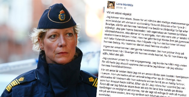 Den svenska asylpolitiken får polisområdeschefen i Älvsborg, Lena Matthijs, att skämmas. Det skriver hon i ett känslosamt och personligt inlägg på Facebook, som fått stor uppmärksamhet.