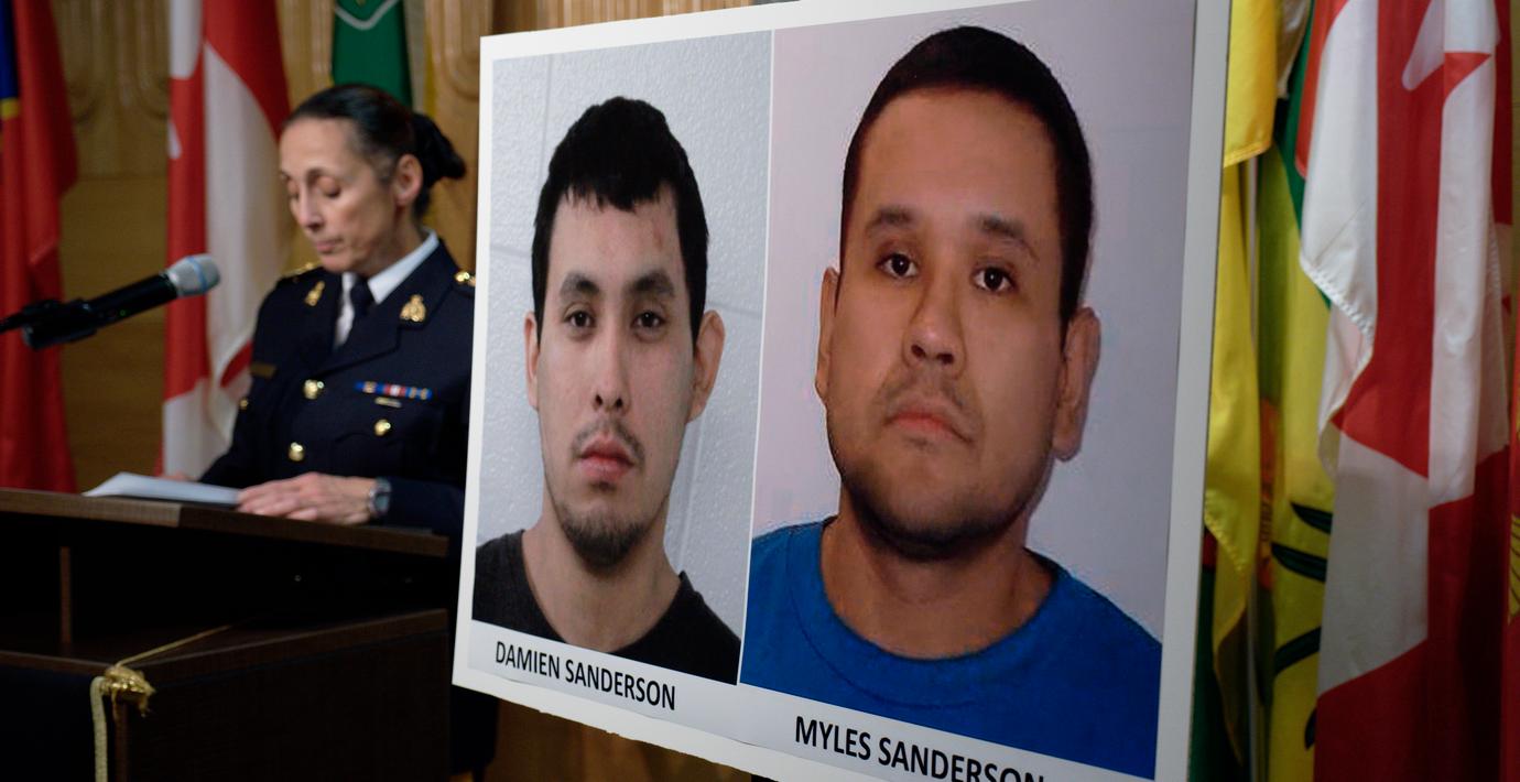 Polisen bedömer att 30-årige Myles Sanderson är farlig och uppger att han troligtvis är beväpnad. Brodern och misstänkte medbrottslingen, 31-åriga Damien Sanderson, hittades död på måndagen.
