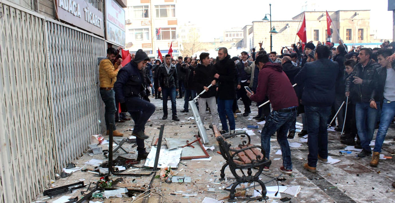Turkiska nationalister har stormat det pro-kurdiska partiet HDP:s kontor i staden Kayseri efter morgonens sprängdåd där minst 13 soldater dödades. Dokument och möbler kastades ut på gatan och partiets skylt togs ner från entrén, skriver AFP med hänvisning till nyhetsbyrån Dogan.