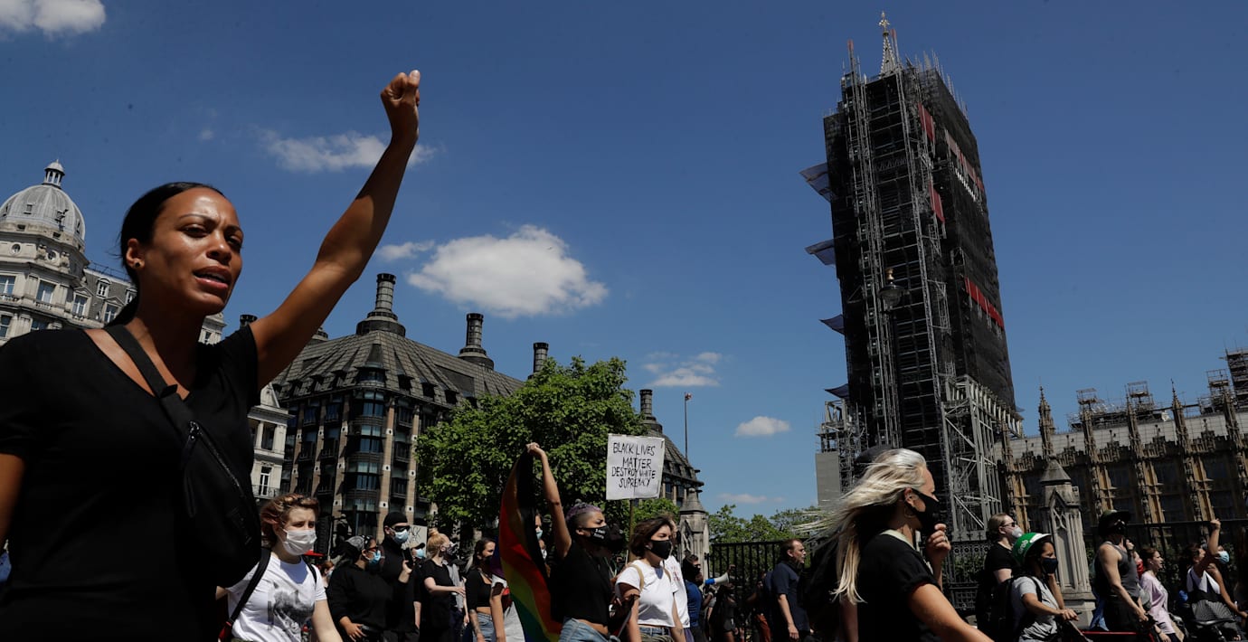 ”Rättvisa för George Floyd” och ”Ingen plats för rasism” stod det på två av plakaten som folkmassorna höll upp i centrala London. Demonstranterna höll bland annat till utanför den amerikanska ambassaden. BBC konstaterar att flera av de tusentals demonstranterna bröt mot virusrestriktionerna.
