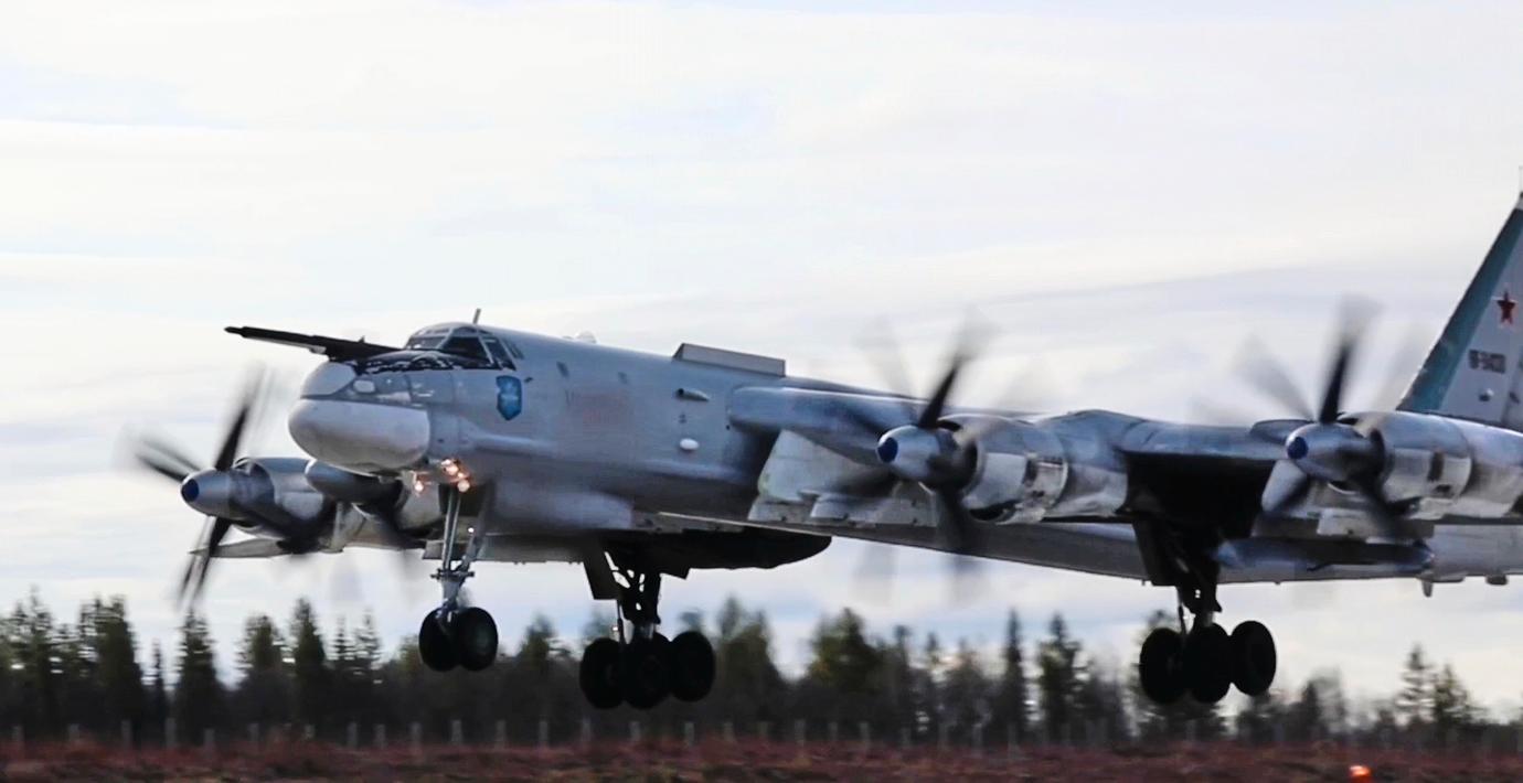 Det kärnvapenkapabla ryska stridsflyget Tu-95MS efter en träningsflygning. (AP)