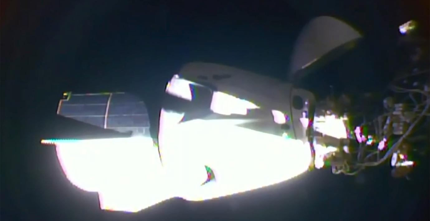 Space X rymdraket har dockat vid den Internationella rymdstationen, ISS. Nasas livesändning visade hur farkosten mycket sakta närmade sig stationen för dockning, och vid 16.16 svensk tid nådde farkosten slutligen stationen efter 19 timmars resa.