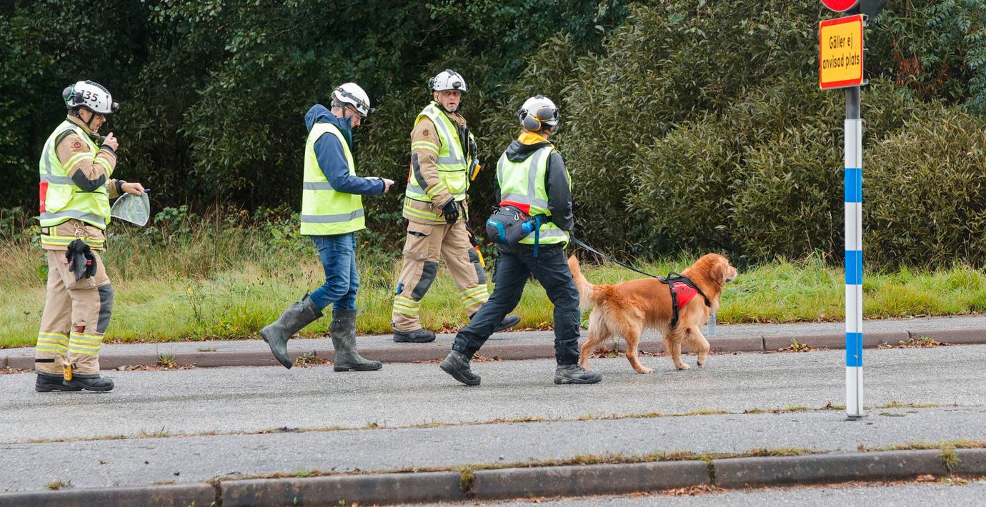 Räddningspersonal söker igenom det drabbade området med hjälp av sökhundar.