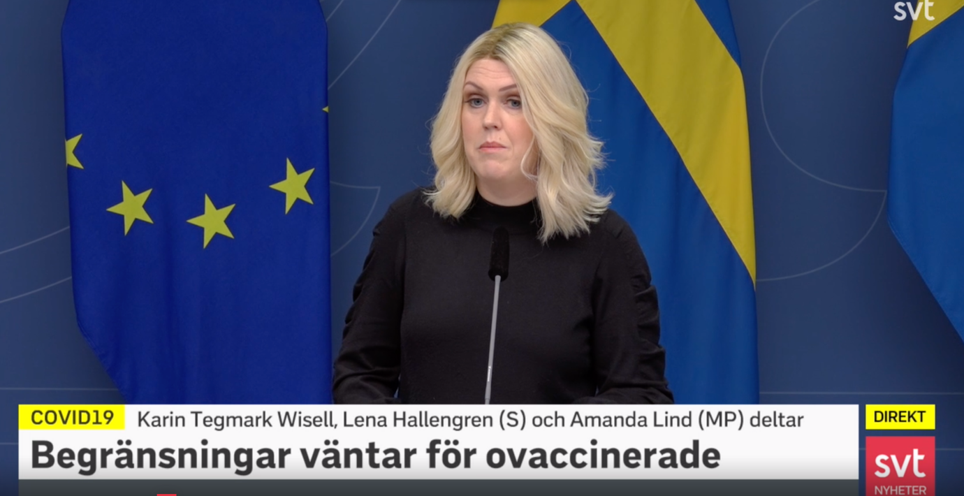 Folkhälsomyndigheten har begärt att vaccinpass ska införas i Sverige, meddelar socialminister Lena Hallengren (S) på en pressträff. Myndigheten vill att passen ska gälla vid inomhusarrangemang med fler än hundra deltagare.