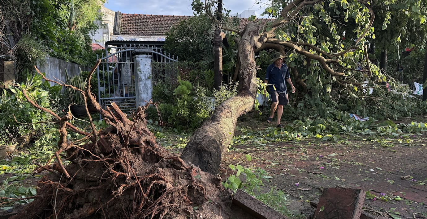 Stormen ryckte upp träd med rötterna och orsakade strömavbrott på flera håll. Nu förflyttas tyfonen inåt landet och har försvagats något, men det finns fortfarande risk för stigande vattennivåer i floder och vattendrag då det kan falla 200 millimeter regn i landets centrala regioner.