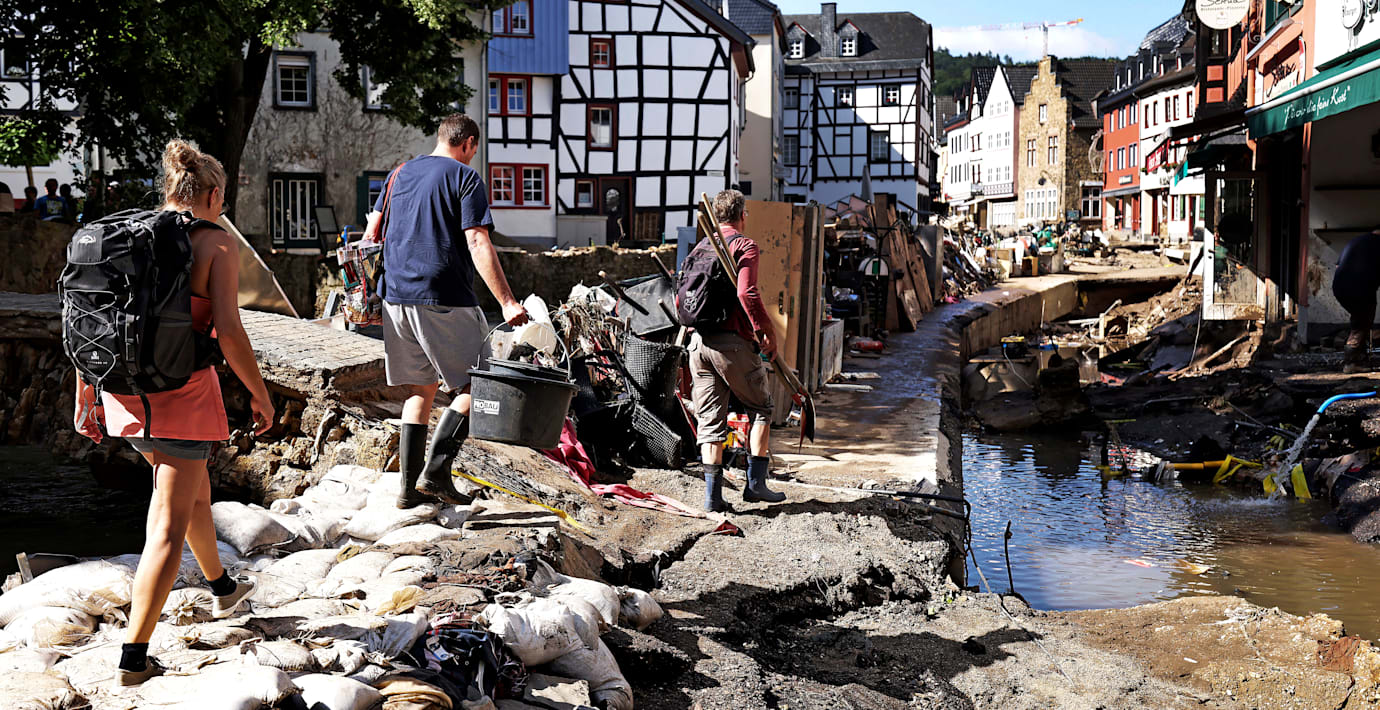 Det regnoväder som har orsakat översvämningar och stor förödelse i västra Tyskland och Belgien har avtagit i styrka och rör sig vidare österut.