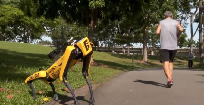 Ett exemplar av robothunden Spot – som tillverkas av amerikanska Boston Dynamics – testas just nu i arbetet med att informera allmänheten om vikten av social distansering i en park i Singapore. Det rapporterar BBC.