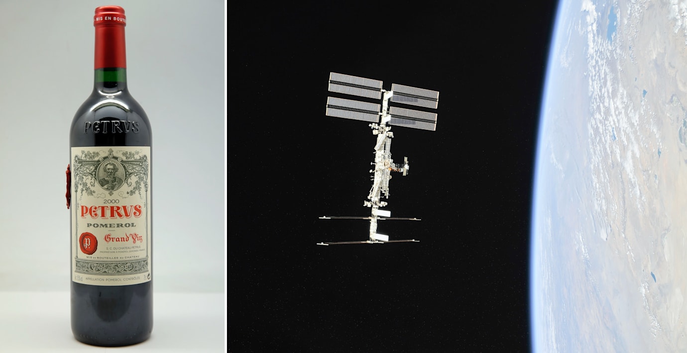 En flaska Bordeaux-vin som lagrats över ett år på den internationella rymdstationen ISS ska säljas på auktion, rapporterar flera medier.