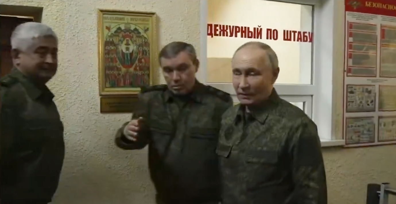 I den statskontrollerade nyhetskanalen RT syns Putin tillsammans med sin generalstabschef Valeryj Gerasimov, som uppger att de ukrainska styrkorna är omringade.