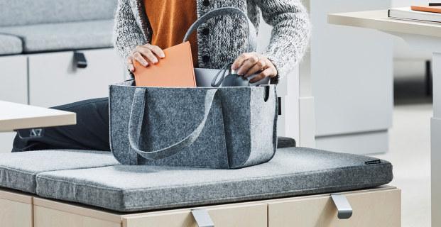 – Vi valde att utforma QBUS i ett lite mjukare filtmaterial. Den är trevligare att förvara vid sin arbetsplats eller ta med på möten än en kundkorg i plast, även om funktionen är densamma.