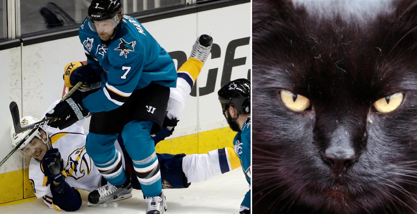 San José vann mot Nashville efter att ha satt alla fem mål i den tredje perioden i nattens NHL-kvartsfinal. Laget hade turen på sin sida och verkade inte påverkade av den objudne gäst som tog sig in på isen under matchuppvärmningen. Då smög nämligen en svart katt in på det glatta underlaget.