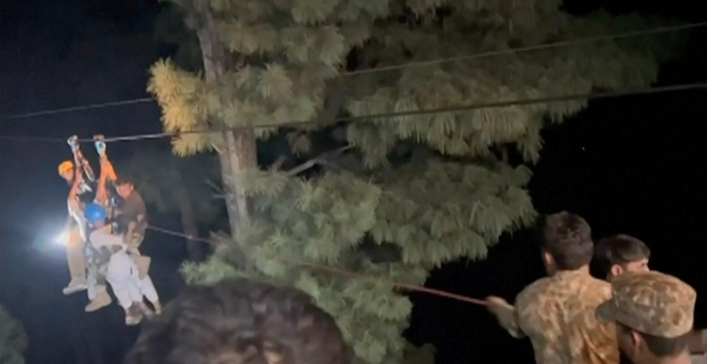 I 16 timmar satt åtta personer fast i en trasig kabinbana 275 meter över marken i Pakistan. Men efter en unik och svår räddningsinsats, där man till slut använde den ena linan till gondolen som en slags linbana, kunde alla räddas, skriver AFP.