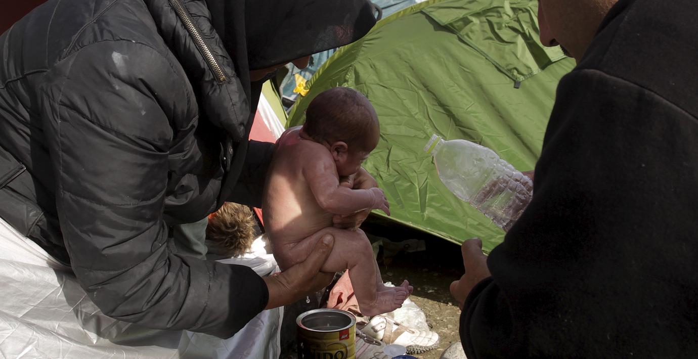 En mamma som tvättar sitt nyfödda barn över en vattenpöl i flyktinglägret i Idomeni nära Grekland. Det jämförde SD-politikern Karin Forell, ledamot i Norrköpings kommunfullmäktige, med grisar i en kommentar på nätet.
