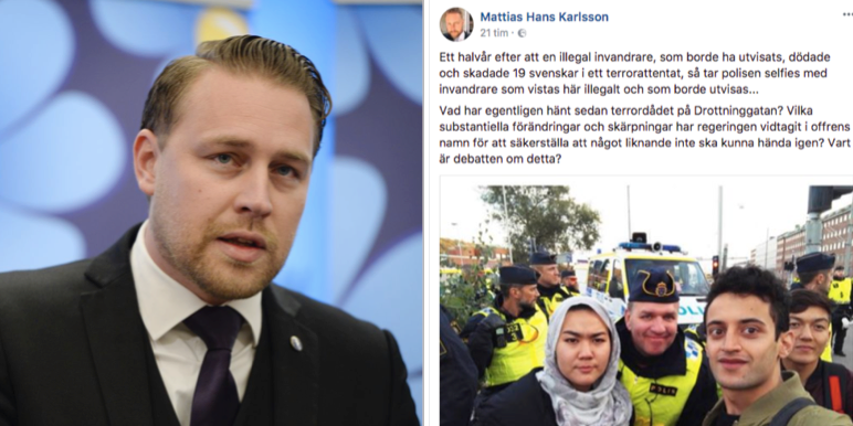 ”Ett halvår efter att en illegal invandrare, som borde ha utvisats, dödade och skadade 19 svenskar i ett terrorattentat, så tar polisen selfies med invandrare som vistas här illegalt och som borde utvisas...”, skriver Karlsson.