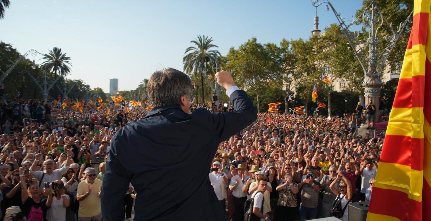 Puigdemont möttes av tusentals jublande anhängare i en park i centrala Barcelona. Evenemanget var organiserat av hans politiska parti, det katalanska självständighetspartiet Junts.