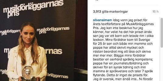 ”Mina föräldrar besitter en oerhörd språklig kompetens; pappa har en journalistutbildning och skriver för en syrisk tidning och min mamma är språkvetare och talar 7 språk flytande. Detta är inget de prisats för. Jag är svensk, men ändå inte. Ni förstår ju varför det är så stort för mig att vinna ett svenskt textförfattarpris”, skriver hon i inlägget.