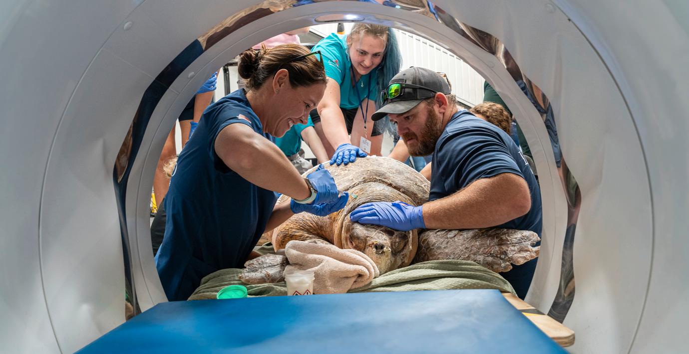 När den jättelika sköldpaddan hittades skadad utanför Floridas kust fick veterinärerna tänka kreativt. Med sina 137 kilo fick Pennywise, som hon kallas, nämligen inte plats i deras vanliga röntgenapparat, skriver AP.
