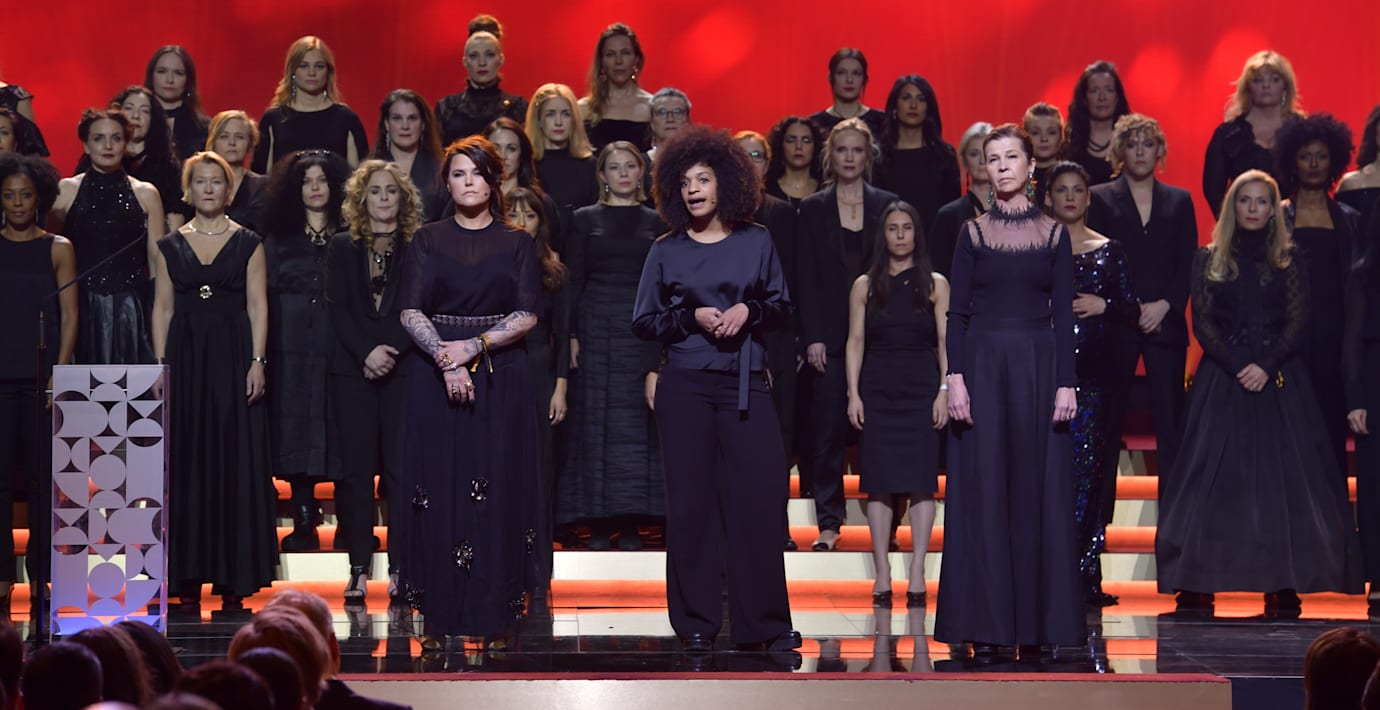Kvinnliga skådespelare utförde en #tystnadtagning-manifestation på Guldbaggegalan. På scenen stod bland andra Lisa Nilsson, Angelika Prick, Helena Bergström och Ingela Olsson.