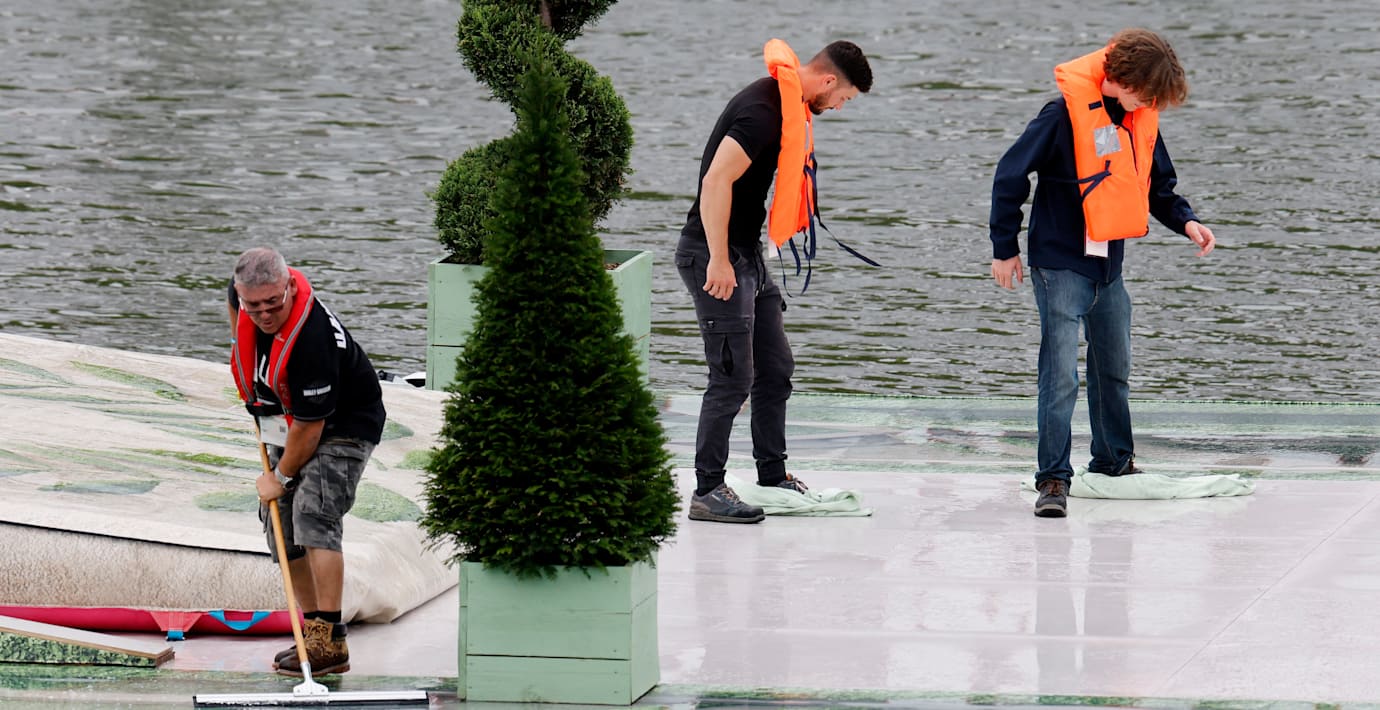 Det har regnat kraftigt i Paris under natten vilket gör att arrangören tvingas skjuta upp dagens tävlingar i skateboard, meddelar organisatörerna enligt TT.