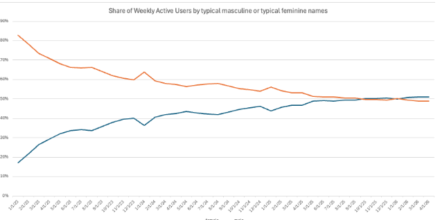 När AI-chattboten lanserades 2022 bedöms omkring 80 procent av användarna ha varit män men nu har skillnaden försvunnit.