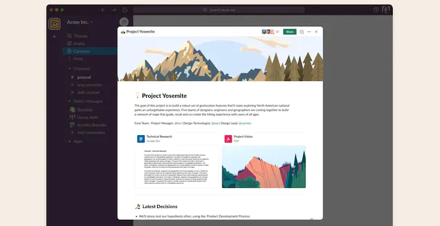 Funktionen – som får namnet Canvas – medger att användarna redigerar dokument med både text och bilder direkt i Slacks gränssnitt. Det går även att klistra in länkar eller andra dokument, som bäddas in med automatik. Flera personer kan även jobba samtidigt på samma dokument, och de kommentarer som kommer i arbetet med ett dokument hamnar i en egen Slacktråd.
