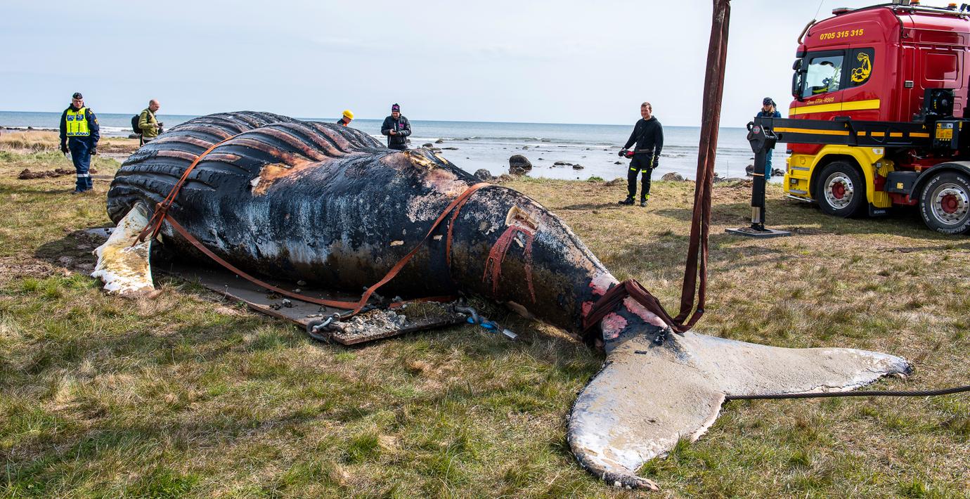 Att hantera kvarlevor av ett så stort djur är komplicerat. Genom att fästa en stålvajer runt knölvalens stjärtfena släpades det åtta meter långa kadavret i land i början av maj. Därefter hissades djuret upp på en lastbil med en förbränningsanläggning i Danmark som slutdestination.