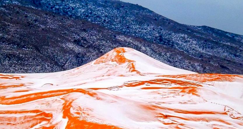 För första gången på 37 år har ett snöfall dragit in över Saharaöknen. Amatörfotografen Karim Bouchetata förevigade ögonblicket den 18 december.