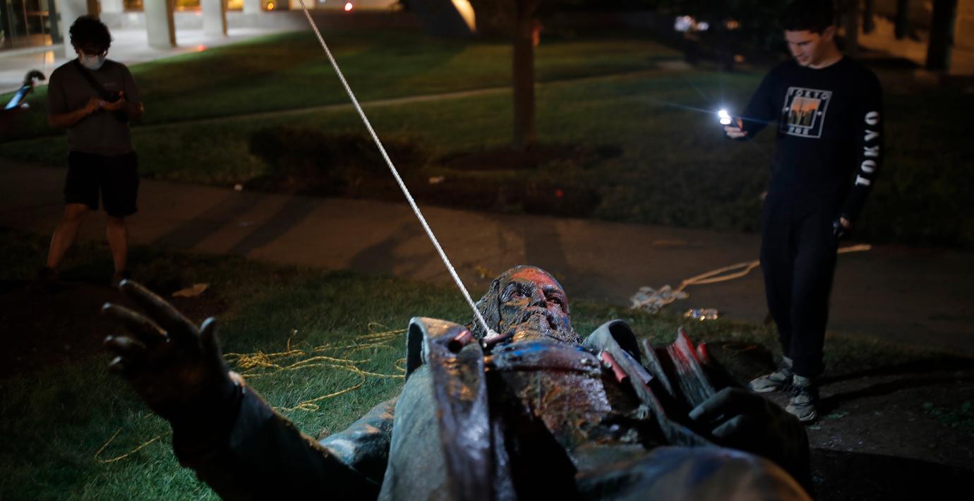 Under protesterna efter mordet på George Floyd 2020 vandaliserades, brändes och fälldes bronsmonumentet. Beslutet att resa statyn kommer efter Donald Trumps presidentorder om att ”återinföra sanning och sunt förnuft i Amerikas historia”.