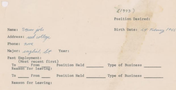 En jobbansökan från den bortgångne Apple-grundaren Steve Jobs auktioneras nu ut av firman RR Auction, och utgångspriset ligger på motsvarande 412 000 kronor. Dokumentet fylldes i för hand av en 18-årig Jobs, som då var en helt vanlig högskolestuderande. Det framgår inte av dokumentet vilket jobb Jobs sökte, men han har bland annat uppgivit att han har färdigheter som ”elektronisk teknik- eller designingenjör” samt att han har arbetslivserfarenhet från Hewlett-Packard.