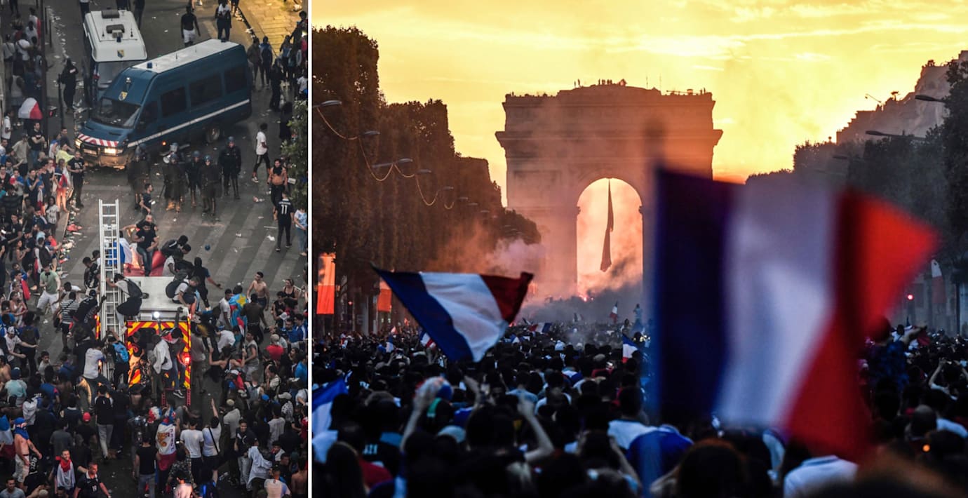 Hundratusentals fransmän firade VM-guldet runt om i landet och på en del håll blev det stökigt. I Paris utbröt flera mindre upplopp, vilket ledde till att folkmassorna möttes med tårgas från kravallpolis. Liknande upplopp ägde rum i Lyon, skriver Le Parisien.