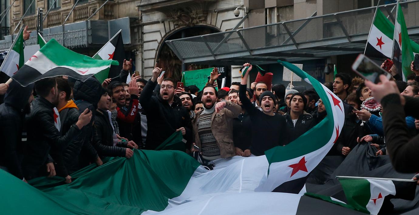 Demonstranterna, framför allt syrier, har bland annat samlats utanför Rysslands ambassad och skrikit Putin-kritiska slagord.
