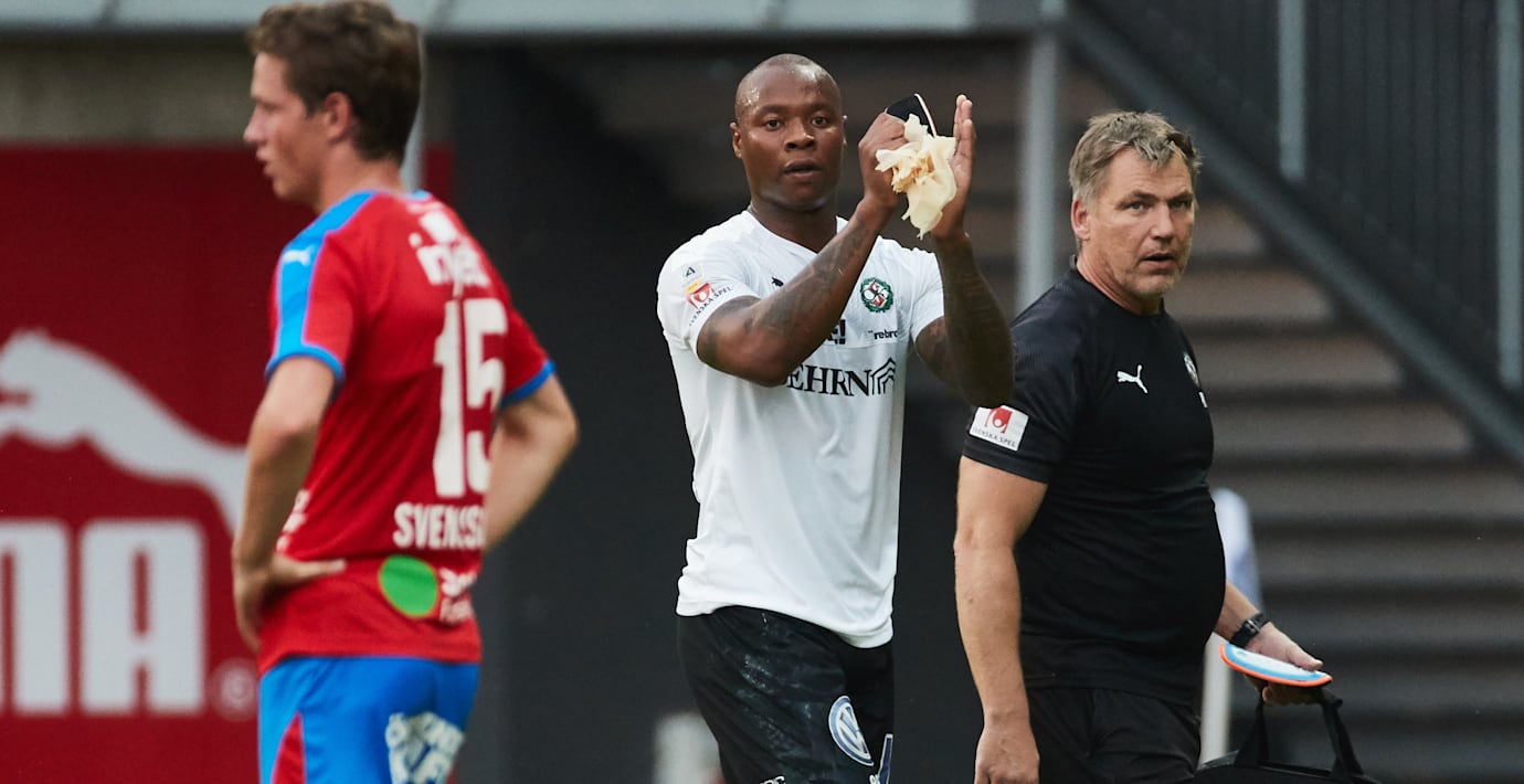 Efter det tredje målet blev anfallaren skadad, satte sig i gräset och gestikulerade för byte.