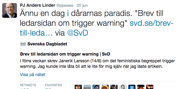 SvD:s ledarsida har startat en ”märklig Twitterstorm”, skriver vänsterorienterade opinionssajten Politism. Tidningen publicerade ett brev från en lärare som berättar om en anställningsintervju där rektorn frågat om han kände till det feministiska begreppet ”trigger warning” – vilket fick snabb viral spridning.