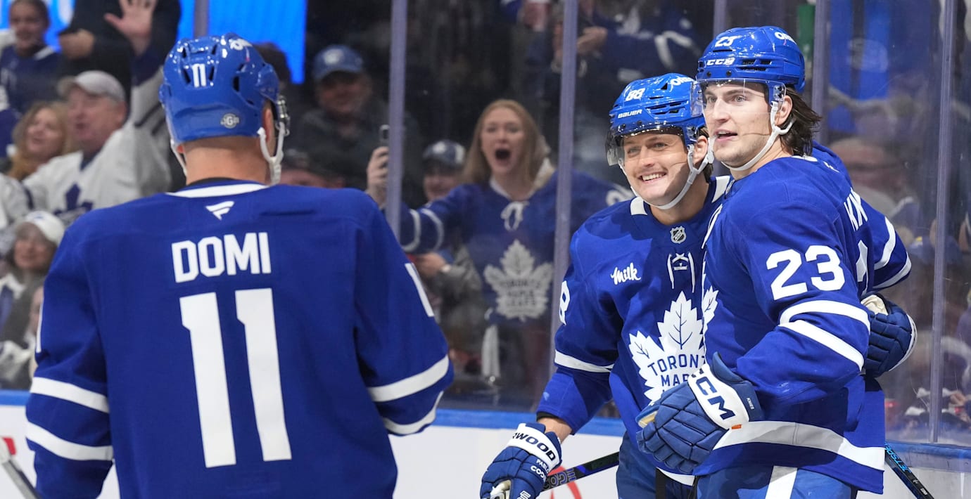 Lagets storstjärna Austin Matthews fick också göra sitt första mål för säsongen, något som gladde lagkamraten Bobby McCann.
