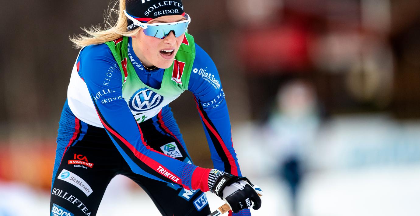 Louise Lindström halkade efter Norge med 40 sekunder på den första sträckan, men Karlsson knappade in 20 sekunder på den andra. Till slut fick Linn Svahn spurta om pallplatsen mot USA:s Novie McCabe.