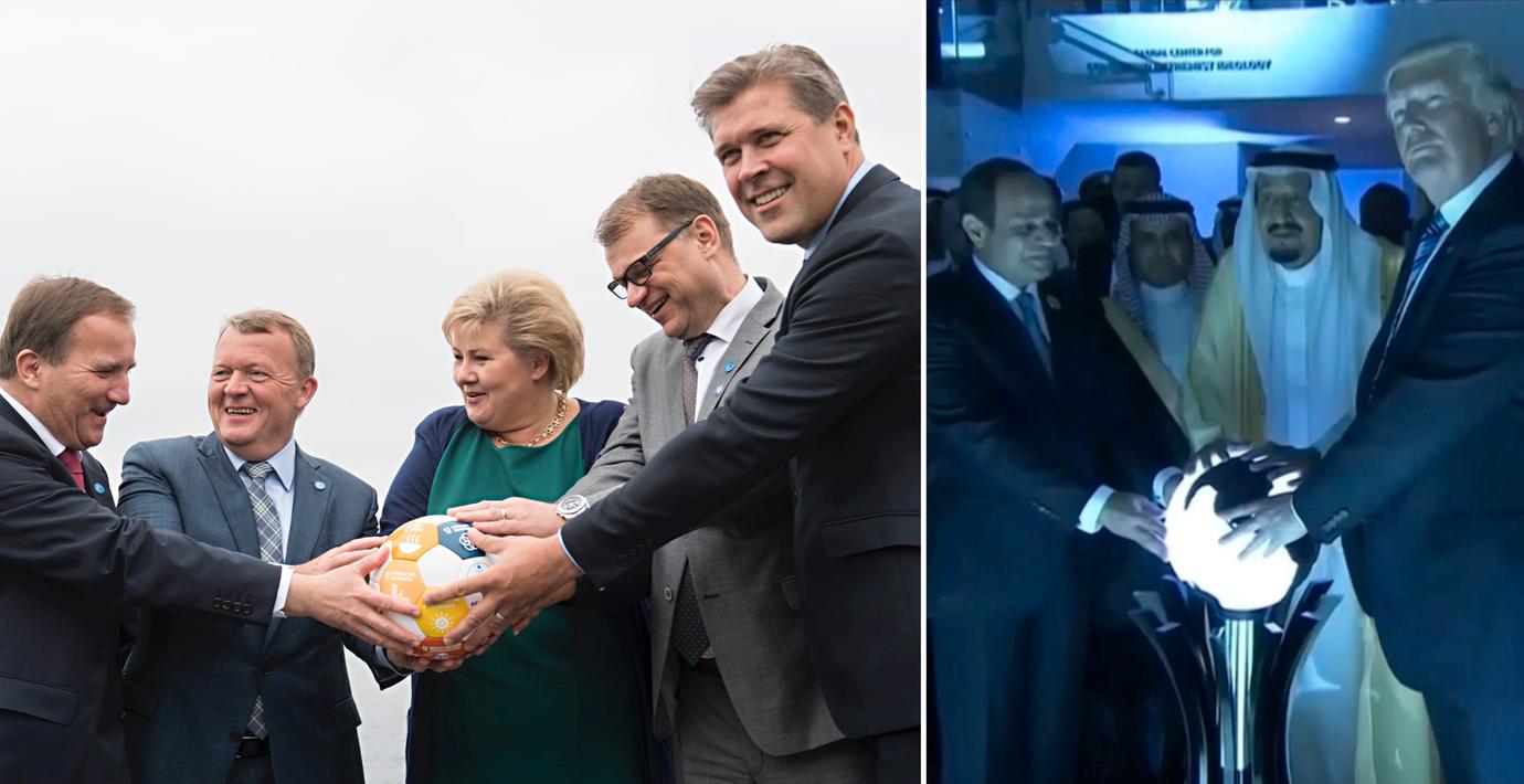 Bilden när Stefan Löfven, tillsammans med de andra nordiska ledarna, lägger händerna på en fotboll har blivit spridd över hela världen. Många har tolkat den som en passning till bilden från Donald Trumps besök i Saudiarabien, där den amerikanske presidenten håller händerna mot ett lysande klot tillsammans med den saudiske kungen och Egyptens president al-Sisi.