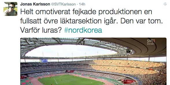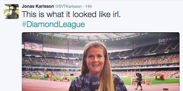 SVT och tittarna matades med fejkade bilder från Internationella friidrottsförbundets tv-produktion från Diamond League-galan i Paris. På bilderna såg Stade de France helt fullsatt ut, men i verkligheten var övre sektionen helt tom, skriver SVT-profilen Jonas Karlsson på Twitter.