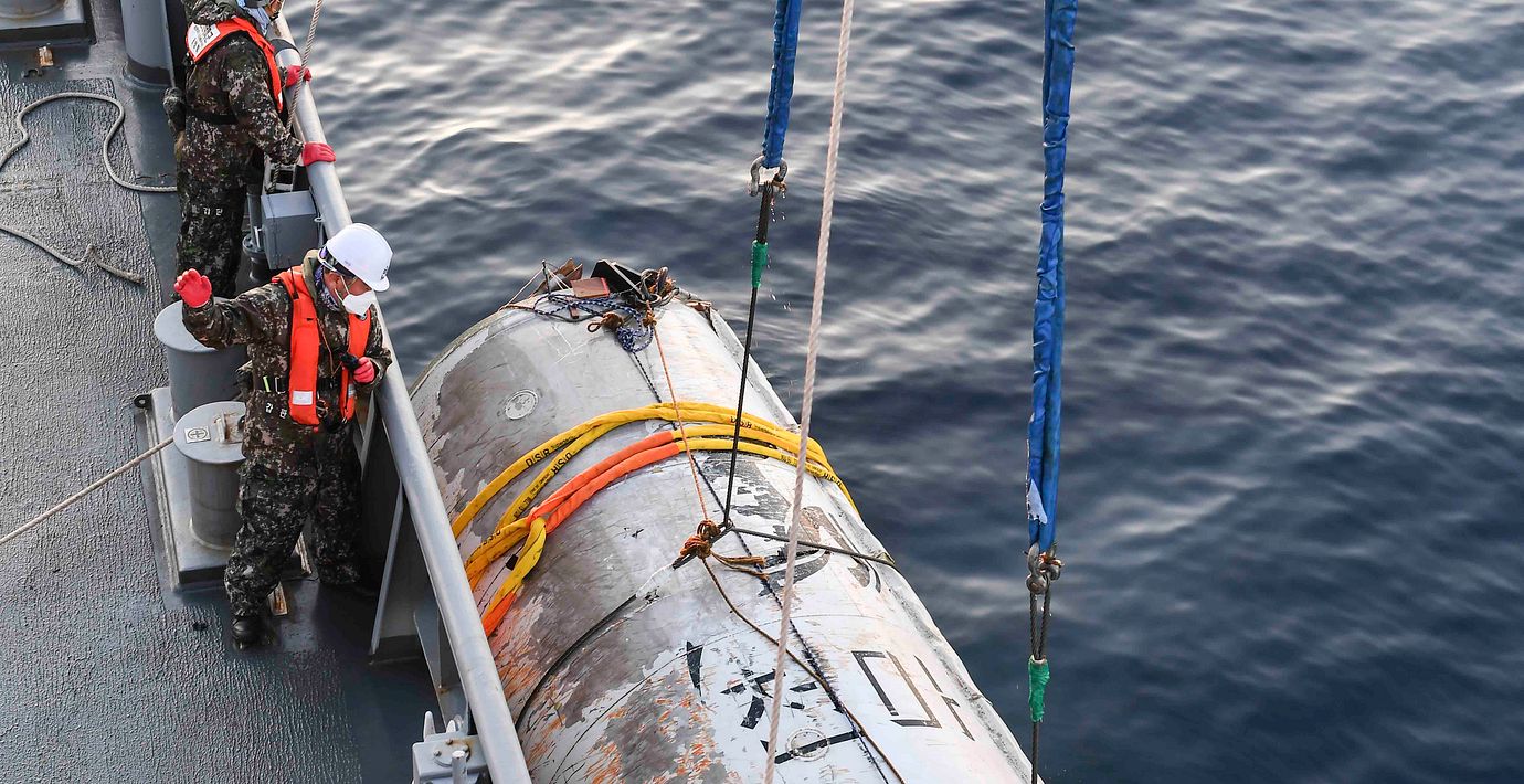 Sydkorea lyckades efter en månadslång bärgningsinsats få tag på vrakdelarna.