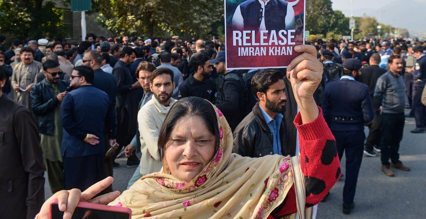 Imran Khan greps 2023 och har dömts till mångaåriga fängelsestraff för bland annat korruption. Hans anhängare hävdar att åtalen är politiskt motiverade.