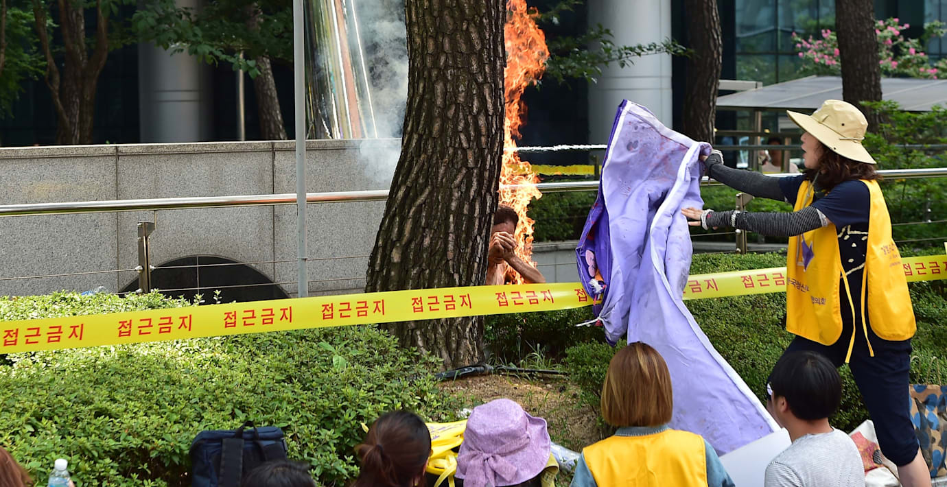En man tände eld på sig själv utanför Japans ambassad i Seoul i Sydkorea vid en protestaktion, rapporterar nyhetsbyrån AFP. Demonstranterna krävde att Tokyo ska be om ursäkt för att under andra världskriget ha tvingat sydkoreanska kvinnor att arbeta på militärbordeller. Mannen är 81 år och från Sydkorea, rapporterar nyhetsbyrån Yonhap. Andra demonstranter reagerade snabbt för att släcka lågorna på hans kropp men hans tillstånd är inte känt.