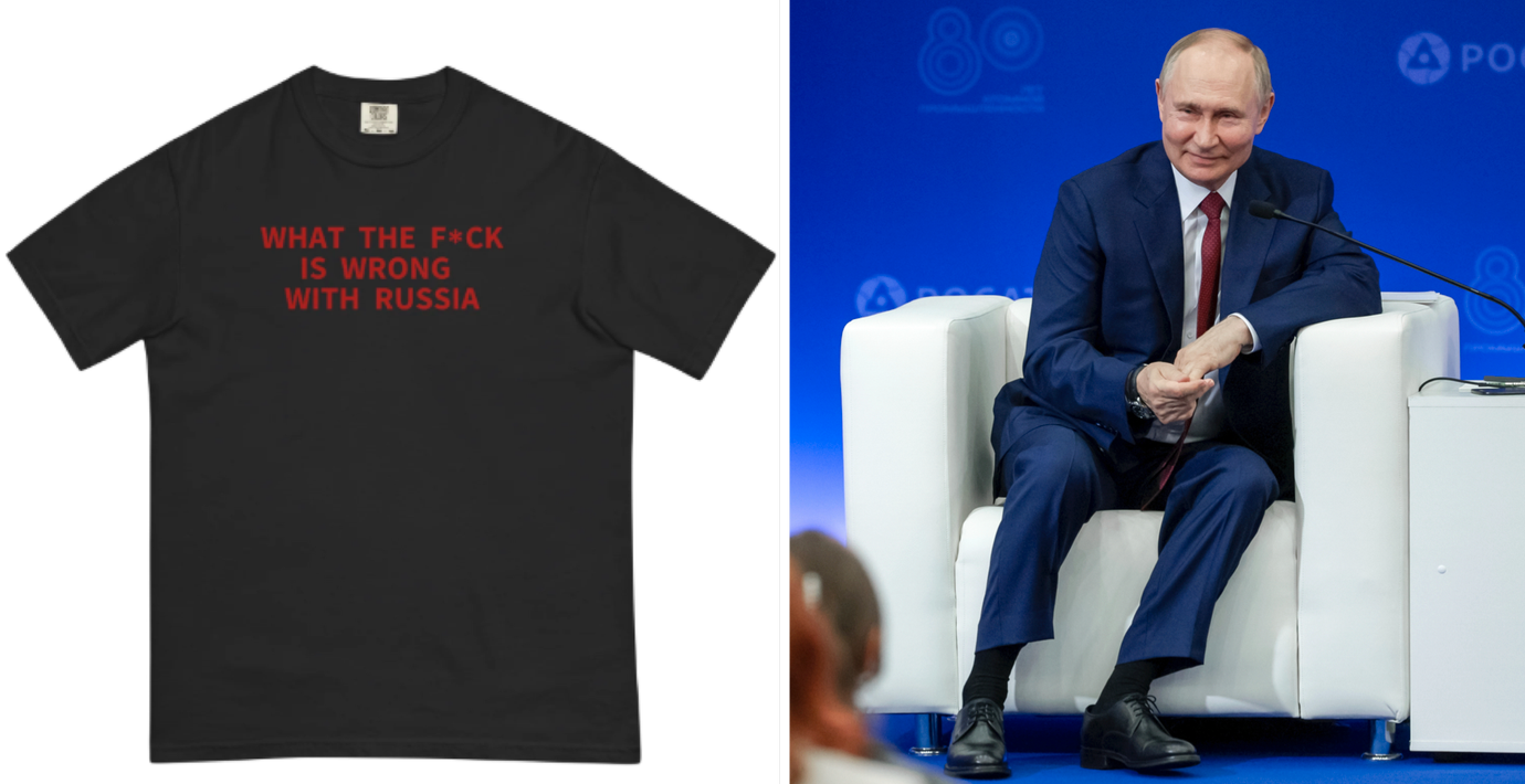 Den ukrainska tidningen Kyiv Independent, som har vuxit sig stor under Ukrainakriget, börjar sälja t-shirts. Tröjorna är svarta med ett enkelt budskap i röd text: ”Vad fan är det för fel på Ryssland”.