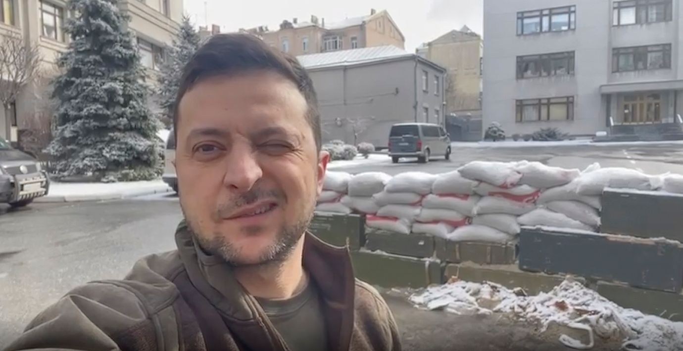 Under den andra dagen av invasionen publicerade Zelenskyj ett videoklipp när han promenerade på gatorna tillsammans flera regeringsföreträdare, samtidigt som strider pågick i närheten, enligt Time.