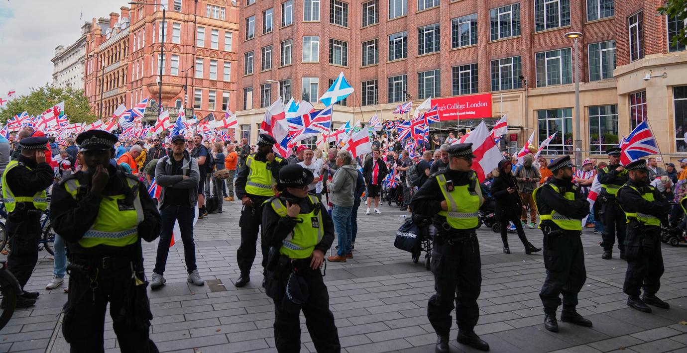 Initiativtagare är den högerextrema aktivisten Tommy Robinson, vars egen sändning från protesterna sågs av hundratusentals personer, skriver The Telegraph. Bilder visar en massiv folksamling, där många deltagare viftar med den brittiska flaggan.