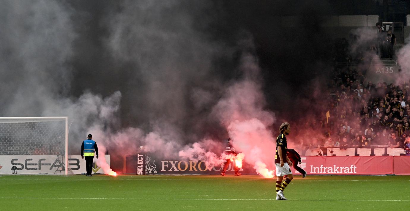 Det var när Djurgården gick upp i ledning sent i matchen som tumult utbröt på AIK:s läktare på Tele2 arena och matchen fick avbrytas. Flera personer kastade stolar och bengaler mot ordningsvakter och polis och maskerade personer tog sig in på planen. Totalt 16 personer åtalades.