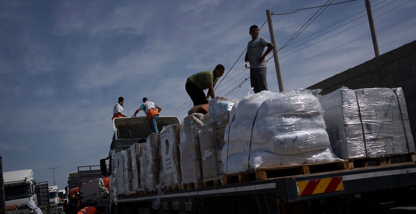 Den första konvojen med förnödenheter till Gazaremsan innehåller 60 ton mat, enligt FN:s Världslivsmedelsprogram. De 20 lastbilarna som släppts igenom den egyptiska gränsövergången rymmer bland annat konserver med tonfisk, mjöl, pasta och bönor. Även mediciner ingår i lasten.