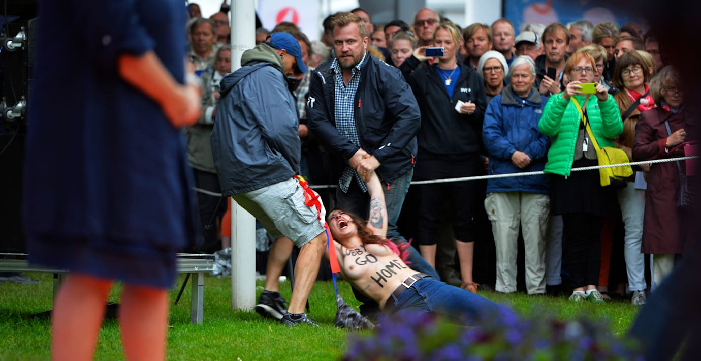 Tre kvinnor ur aktivistgruppen Femen har anhållits efter att ha tagit sig förbi en polisavspärrning och barbröstade försökt störa statsminister Fredrik Reinfeldts tal i Almedalen på torsdagskvällen.