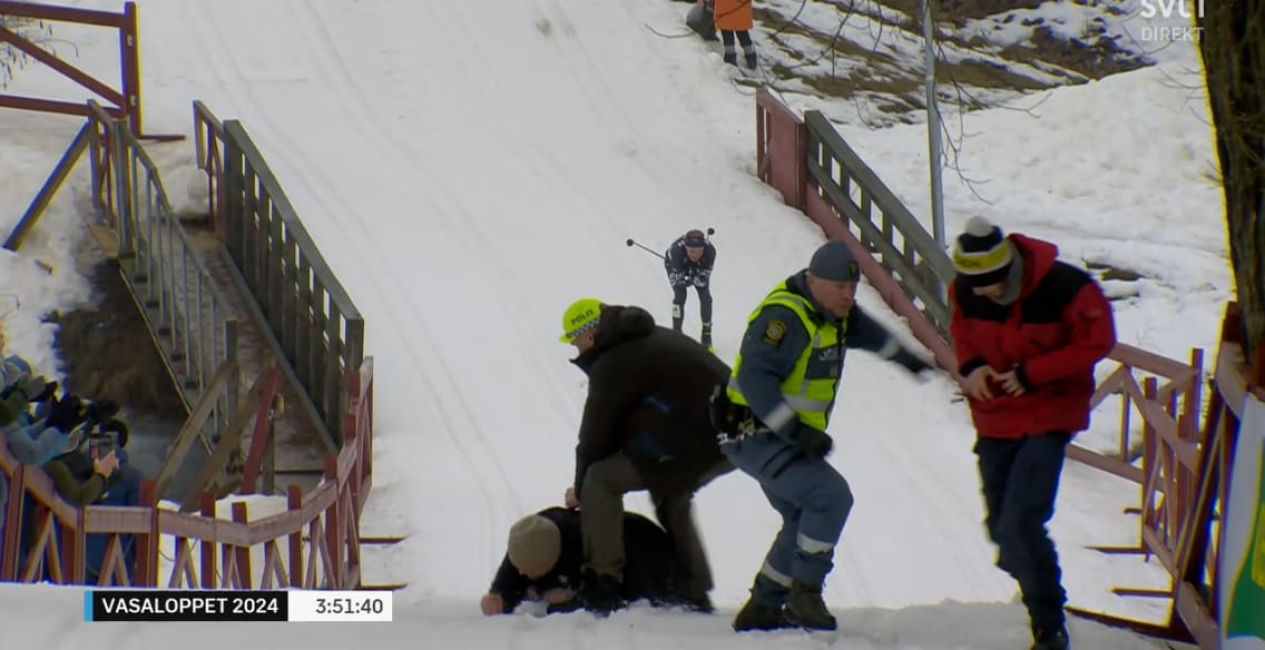 Tumultartade scener uppstod strax före målgång på Vasaloppet. När vinnaren Torleif Syrstad närmade sig mållinjen sprang tre personer in på spåret. Alla brottades ner av säkerhetsvakter och incidenten kunde avvärjas utan större dramatik.