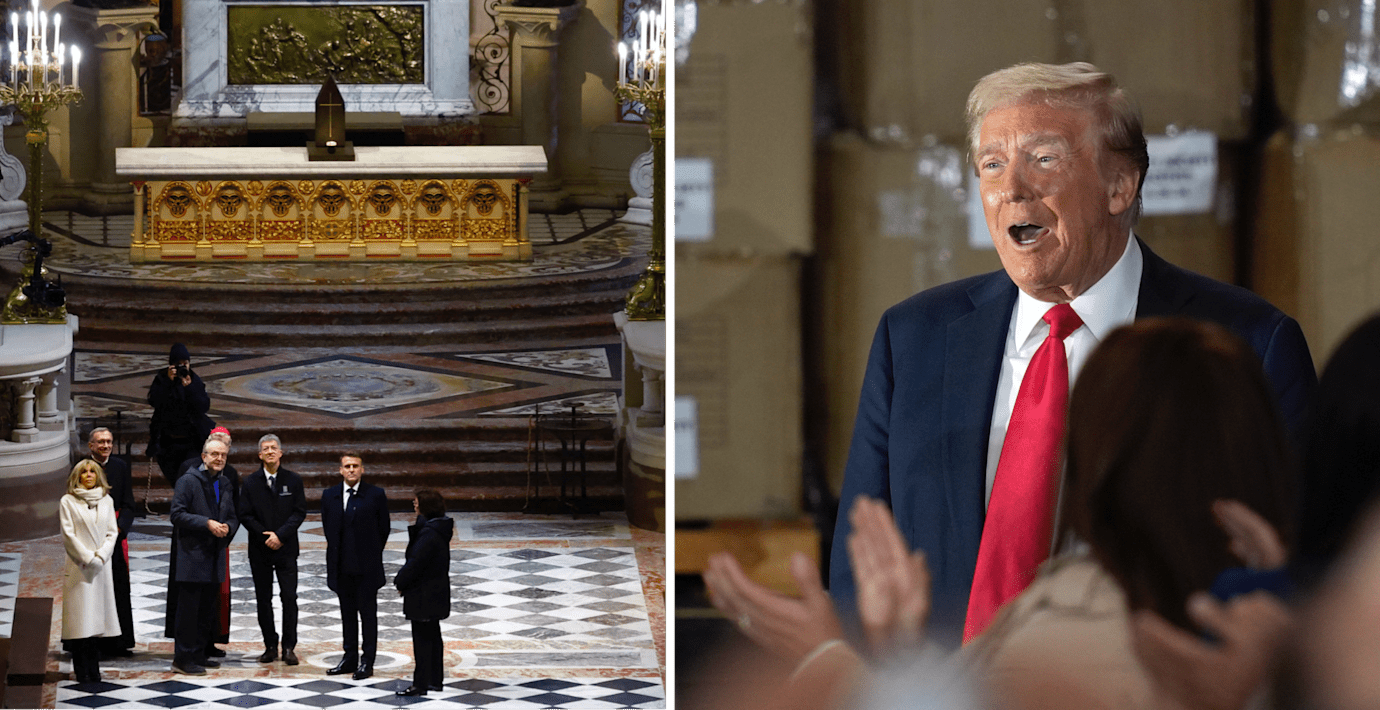 ”President Emmanuel Macron har gjort ett fantastiskt jobb för att säkerställa att Notre Dame har återställts till sin fullaste prakt”, skriver han på sin egen sociala medier-plattform Truth Social.