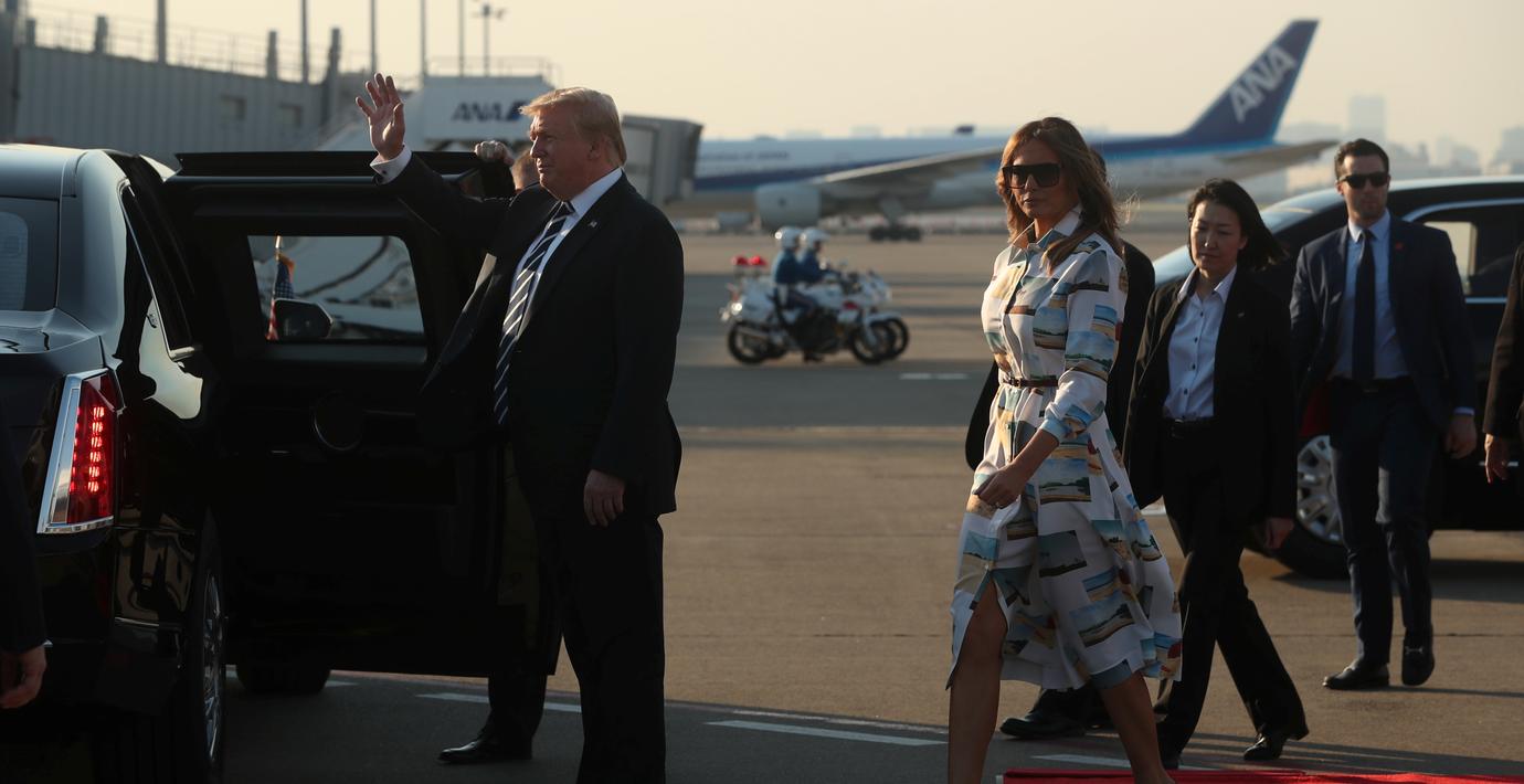 I dag landade presidenten i Tokyo för den fyra dagar långa resan i landet där han väntas diskutera handel och de ökade hoten från Nordkorea och spela golf med premiärminister Shinzo Abe.