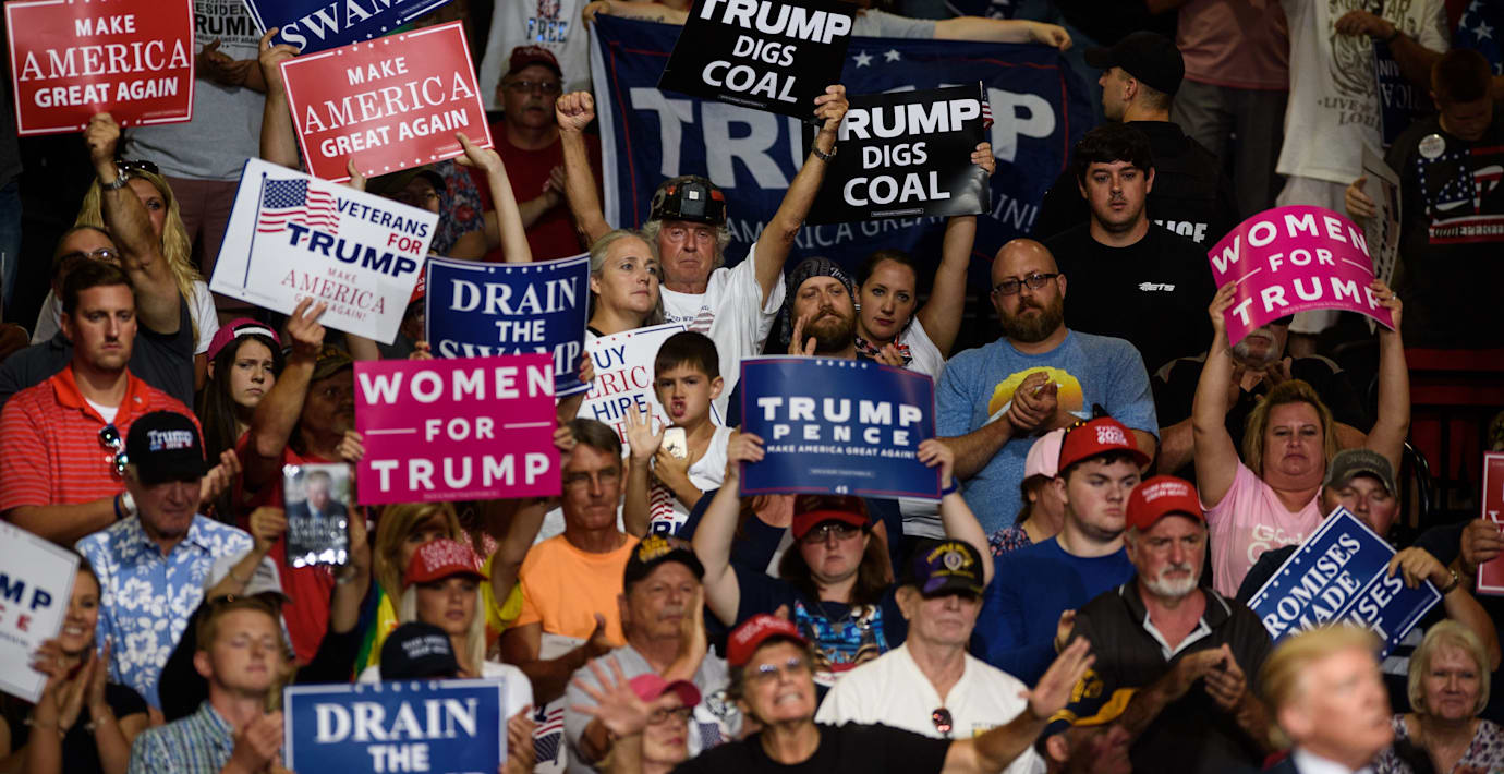 När molnen hopar sig över Vita huset så flyr presidenten till sin trygga zon: en arena fylld av supportrar som skanderar hans namn. Det skriver The Guardians journalist David Smith i en analys.